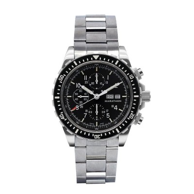 46 mm skersmens „Marathon“ nerūdijančio plieno „Jumbo“ piloto/nardytojo automatinis chronografas (CSAR) 46 mm skersmens „Jumbo“ piloto/nardytojo automatinis chronografas (CSAR) dažnai vadinamas paieškos ir gelbėjimo chronografu (CSAR) ir yra pats geidžiamiausias laikrodis mūsų SAR kategorijoje. Laikomas mūsų laikrodžių „Šventuoju Graliu“, jis puikiai tinka tiems, kurie reikalauja geriausios kokybės ir našumo. 25 brangakmenių automatinis chronografo mechanizmas pasižymi 1/5 sekundės tikslumu, o chronometro funkcija skrydžių žurnalams ir degalų sąnaudoms stebėti naudoja 1/100 minutės dešimtainį laiką. Laikrodis gali sekti praėjusį laiką iki 12 valandų, todėl tai idealus pasirinkimas pilotams ir narams. Mechanizmą maitina „ETA Valjoux 7750“ mechanizmas su „Incabloc®“ amortizatoriumi, užtikrinančiu patikimą ir tikslų laiko rodymą visose situacijose. Laikrodis taip pat turi kalendorių su diena ir data. CSAR laikrodyje yra tričio dujų vamzdeliai ir „MaraGlo™“ apšvietimo funkcijos, kad būtų lengva skaityti esant prastam apšvietimui. Stiklas pagamintas iš safyro kristalo, todėl yra atsparus įbrėžimams ir patvarus, o užsukamas vainikėlis užtikrina atsparumą vandeniui iki 30 atm. Korpusas ir apyrankė pagaminti iš 316L nerūdijančio plieno ir apdailinti šlifuota tekstūra, suteikiančia laikrodžiui elegantišką ir modernų vaizdą. Vienakryptis rėmelis turi 60 minučių skalę, o laikrodis yra atsparus 30 atm, todėl puikiai tinka nardymui ir kitai vandens veiklai. Laikrodžio korpuso skersmuo yra 46 mm, storis – 18 mm, o kilpelės plotis – 22 mm. Mechanizmas: ETA Valjoux 7750 su Incabloc™ technologija. Amortizatorius