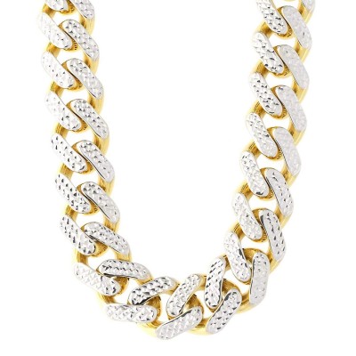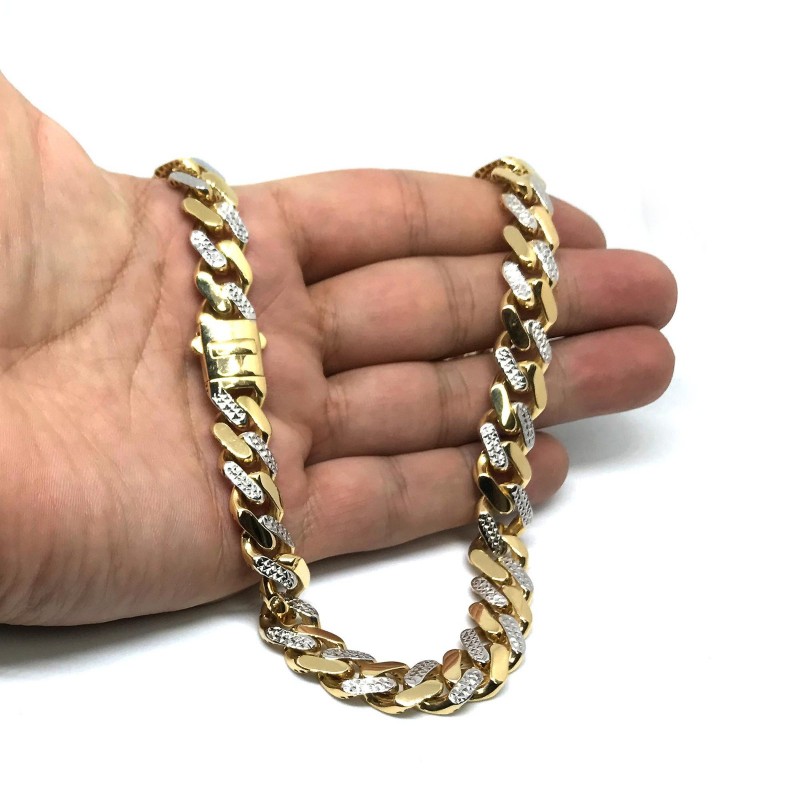 Ši 14 karatų geltonojo ir baltojo aukso Majamio kubietiško stiliaus grandinėlė pasižymi moderniu vėrinio įvaizdžiu. Grandinėlės storis – 11,3 mm, o ilgis – 24 coliai. Ji puikiai tinka pakabukams arba gali būti nešiojama viena. Abiejose pusėse yra dėžutės formos sagtis su sagutėmis, todėl yra patvari ir patogi, ją gali nešioti tiek vyrai, tiek moterys. Vėrinys sveria 41,3 gramo ir yra pažymėtas 14 karatų praba. – Ši grandinėlė pagaminta iš tikro 14 karatų geltonojo ir baltojo aukso ir pažymėta 14 karatų praba. – Šie Majamio kubietiško stiliaus grandinėlės formos vėriniai puikiai tinka nešioti vienus arba su pakabukais. – Vėrinio plotis – 11,3 mm. – Vėrinys turi dėžutės formos sagtį ir yra poliruotas, kad atrodytų blizgiai. – Vėrinio svoris gramais: 41,3 g.